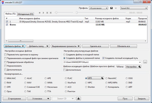 XRecode II — популярный и мощный аудио конвертер, обладающий удобным «drag and drop»-интерфейсом и поддерживающий большинство распространенных форматов, который позволяет быстро и без особого труда преобразовывать аудио-данные. Поддерживается извлечение аудио дорожки из видео файлов и граббинг многоканальных Audio CD. Возможность создания одного большого аудио файла из нескольких и создание .CUE файла.