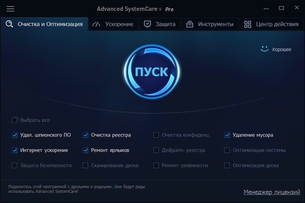 - Выполняет полный спектр работ для достижения наилучшей производительности. Простая очистка реестра не может обеспечить действительно серьезного увеличения скорости работы. Advanced SystemCare Pro совмещает очистку реестра, дефрагментацию, тонкую настройку системы, восстановление поврежденных ярлыков, удаление персональной информации из временных файлов, удаление ненужных файлов, восстановление и оптимизацию диска и многое другое – все, что требуется, чтобы ваш компьютер работал как новый.
