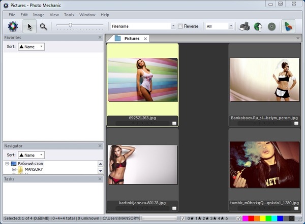 Программа ориентирована на отображение миниатюр изображений и импорт снимков с цифровых камер, однако с таким же успехом они могут загружаться с жесткого диска. Пользователь может быстро вращать, просматривать, копировать, удалять, помечать и переименовывать фотографии и добавлять к ним ключевые слова. Photo Mechanic поможет найти лучшую фотографию среди нескольких похожих снимков.