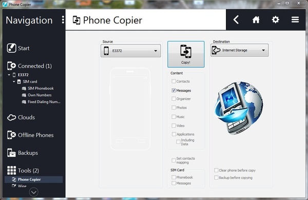 MOBILedit! Phone Copier — программа, которая позволяет переносить адресную книгу, фотографии, музыку, рингтоны, SMS, настройки телефона, историю звонков, поиска, закладки с одного телефона на другой. Поддерживаются тысячи разных моделей смартфонов, и, соответственно, практически все мобильные платформы, включая Symbian, BlackBerry, Windows Mobile, iOS, Android. Импортировать данные можно либо через онлайн-сервер, либо поочередно подключая аппараты к компьютеру.