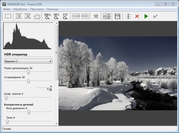Программа Fusion HDR позволяет улучшить проработку деталей, увеличить локальную контрастность цифровых фотографий. Наилучший результат получается путем обработки нескольких снимков одной сцены с различной экспозицией. Но программа позволяет обрабатывать так-же и одиночные снимки как сырых форматов (RAW) так и форматов JPEG, TIFF. Объединение экспозиций и обработку можно произвести одним из двух операторов: HDR или суммированием с приоритетами. Оператор пакетной обработки позволит обрабатывать серии фотографий в автоматическом режиме, применяя к каждой серии одинаковые параметры.
