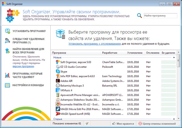 Soft Organizer - утилита для полного удаления программ из системы. Имеет мощную функциональность, позволяющую полностью удалить приложение из системы. Ключевой особенностью программы Soft Organizer является возможность полного удаления программ из системы, построенная на технологии Full Uninstall™. Для этого Soft Organizer отслеживает все изменения, которые происходят в системе во время установки интересующего приложения. В будущем, при необходимости, Soft Organizer воспользуется этими данными и полностью удалит программу из системы.