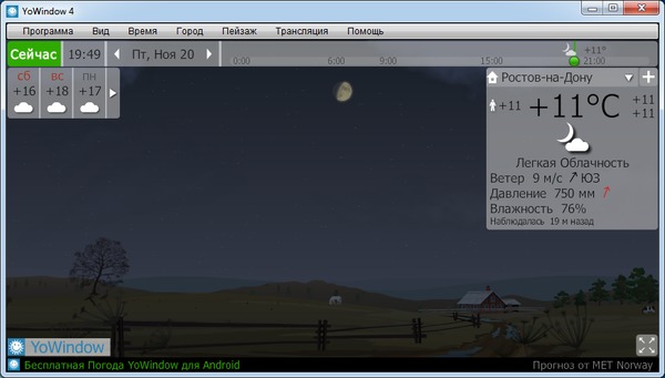YoWindow - это монитор погоды. Программа отображает пейзаж, изменяющийся в зависимости от погоды, дневного освещения и времени года. Программа исправно отображает все возможные погодные явления: облака, дождь, снег, ветер, туман, грозу, а также солнце, луну и звезды. По сути YoWindow это модель обычного окна. Но в YoWindow у Вас есть возможность перемотать время вперед и заглянуть в будущее - увидеть прогноз погоды в нужный момент времени. В настройках YoWindow можно включить программу в автозапуск, выбрать для отображения информационные панели (интерактивная временная шкала, панель прогноза, инспектор, активировать анимацию погодной картины). Если нас интересует не только температура воздуха, то на экран следует вывести информацию о диапазоне температуры (какая она есть и какая она по ощущению), картинке неба, ветре, давлении, влажности, количестве осадков, видимости, времени восхода и заката, долготе дня и фазе луны. Также настраивается количество дней для отображения прогнозов, пейзаж (по умолчанию это “Деревня”), единицы измерения (фаренгейты, цельсии, мили, метры, узлы и прочее).