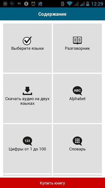 Для того чтобы данное приложение считалось универсальным, и охватывало собой большой процент пользователей Android девайсов, разработчики из компании «50languages», внесли в нее возможность выбора как языка для обучения, так и языка на котором оно будет проходить. То есть, таким образом любой человек, с любого континента сможет изучить любой язык.