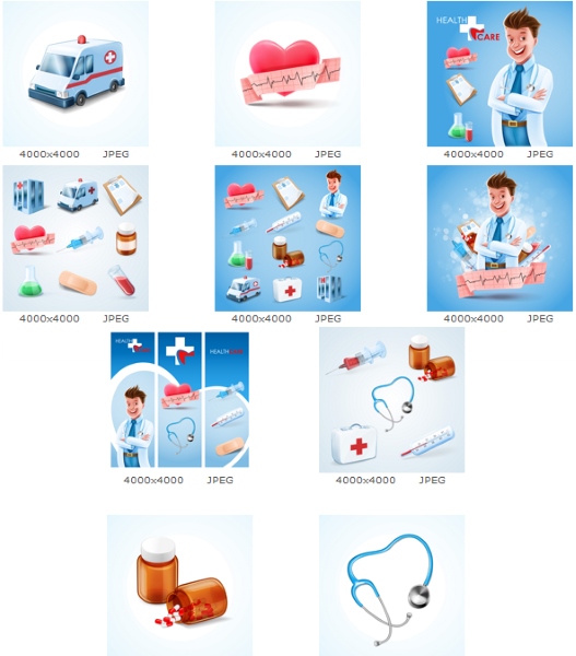 Векторный клипарт на тему лечения и здоровья. В данном паке присутствует автомобиль скорой помощи, врач, таблетки, пластырь, кровь, шприц, сердце, термометр и др. Всё для улучшения кровообращения и Вашего сердцебиения.