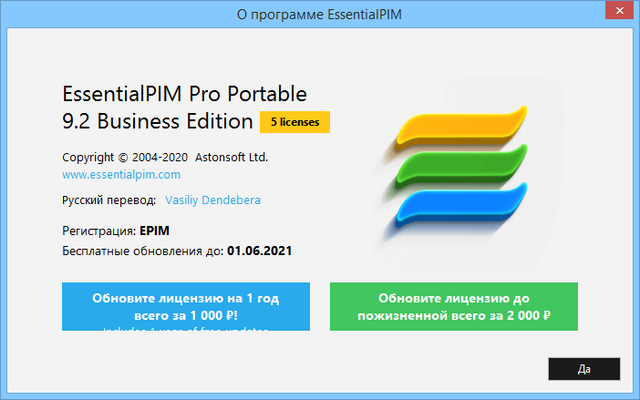 В какой-то момент начало вылезать напоминание обратиться на офсайт для подтверждения лицензии, после нескольких напоминалок с периодичностью 5-15 минут. EssentialPIM схлапывается. На разных компах и ОС одна и та же ситуевина. Примечательно, что пока не открываешь свою БД, то вроде лицензию не хочет. Как и где можно исправить в бд этот казус? С уважением и надеждой.