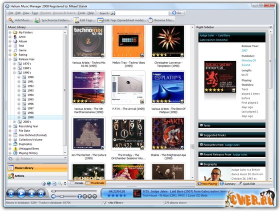 До версии 2008.0.0.6158 обновился Helium Music Manager - продвинутый музыкальный менеджер, облегчающий систематизацию музыкальной коллекции. Представляет из себя одновременно редактор тегов и имн файлов по тегам, музыкальную базу-каталог и создатель плейлистов по ней. Так же, есть возможность создания отчтов по коллекции и быстрый поиск по базе. Немаловажными плюсами является корректная работа со сменными девайсами (CD/DVD) - файлы с них отображаются отдельно, поиск обложек/обзоров/названий треков по различным сервисам, запись CD/DVD, поддержка плагинов, есть даже плагин для Winamp и многое другое. Программа совместима с Windows Vista.