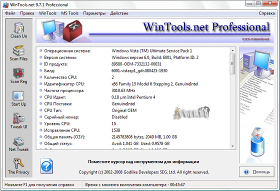 WinTools.net Professional – набор инструментов для оптимизации операционной системы Windows. В состав программы входят компоненты для полного удаления нежелательных программ и «мертвых» ссылок реестра, а также для контроля процессов, настройки системы, интернет-соединений и интерфейса. Кроме того, имеются утилиты для надежного хранения конфиденциальной информации. Работает на платформах Windows 2000, 2003, XP и Vista.
