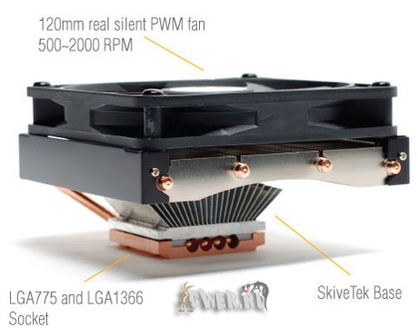 Согласно приведенным спецификациям, дебютант весом 475 г выполнен в низкопрофильном форм-факторе и обладает габаритами 138 x 123 x 70,3 мм. Изделие имеет медное основание с технологией SkiveTek, рассчитано под Socket LGA1366/775 и снабжено четырьмя медными тепловыми трубками диаметром 6 мм каждая, которые пронизывают невысокий радиатор со множеством тонких алюминиевых пластин. На радиаторе установлен вентилятор типоразмера 120 x 120 x 20 мм, скорость вращения которого автоматически регулируется в зависимости от изменений температуры и составляет от 500 до 2000 оборотов в минуту, тогда как уровень создаваемого "пропеллером" шума не выходит за пределы диапазона 15-24 дБ.