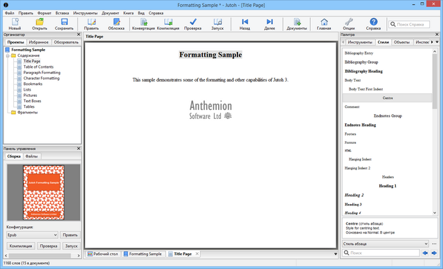 Anthemion Jutoh - программа для создания электронных книг буквально за несколько секунд из уже имеющихся файлов, используя New Project Wizard, а также создание e-book книг, используя встроенный стилизованный текстовый редактор. Обложки книг можно выбрать из шаблонов Jutoh's или создать свои при помощи встроенного кавер-редактора. Созданные проекты электронных книг вы можете продать на различных сайтах.