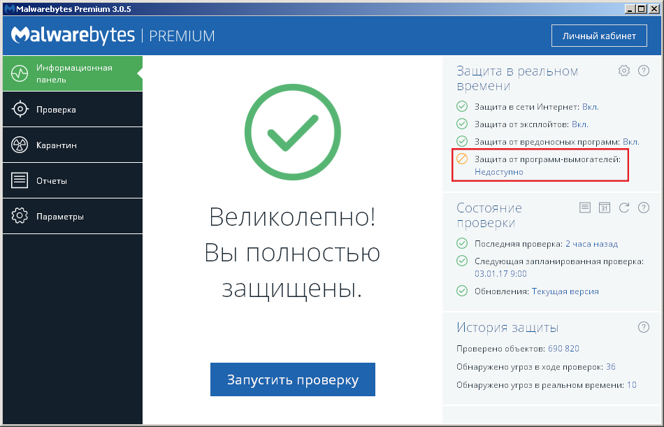 Данные проблемы наблюдаются, даже если программа MalwareBytes 3 PREMIUM не запущена, но модуль самозащиты включен.