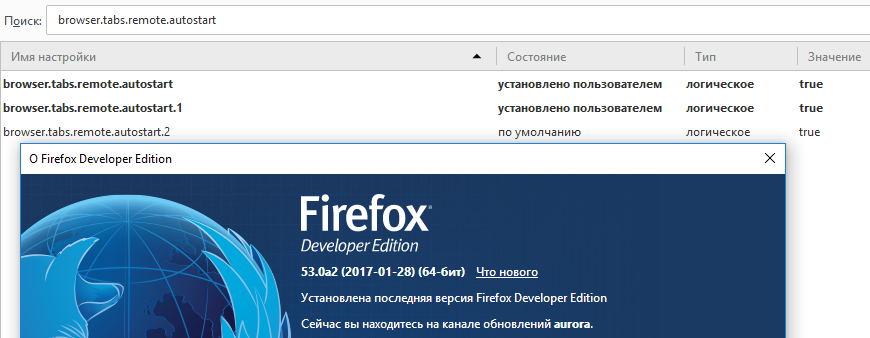 Можете подсказать, почему у меня 3 настройки с именем "browser.tabs.remote.autostart"
