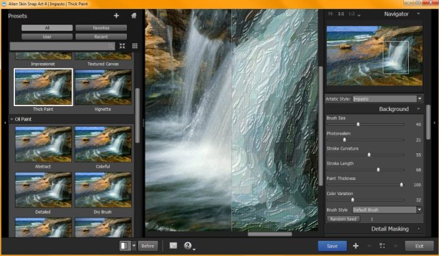 - Snap Art – плагин содержит большую библиотеку предварительных заготовок, которые дают вам возможность всего одним щелчком мыши создать картины написанные или нарисованные маслом, углем, акварелью, цветными карандашами, ручкой и чернилами, пастельными мелками, а также в стиле комиксов, пуантилизма и импасто (наложение красок густым слоем) на разной основе: холст, бумага и т.д. Программа может работать как плагин к Adobe Photoshop так и в автономном режиме. Snap Art предлагает более 200 пресетов в 12-ти основных стилях. При создании рисунка Snap Art учитывает контуры объектов на исходной фотографии, благодаря чему мазки и штрихи ложатся естественно. В каждом пресете можно можно настроить различные параметры эффекта, а также тон изображения, освещение, виньетирование и тип холста, на который должен быть наложен эффект. Кроме того, Вы можете создавать и сохранять понравившиеся собственные эффекты, как пользовательские настройки.