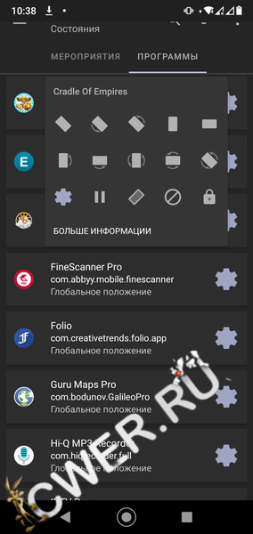 - включение режимов поворота для конкретного приложения в отдельности;