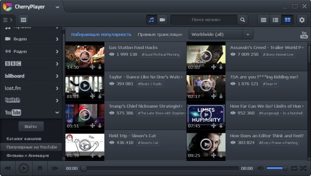 - Встроенные топ плейлисты YouTube, Twitch.tv, BBC, Billboard, Last.fm