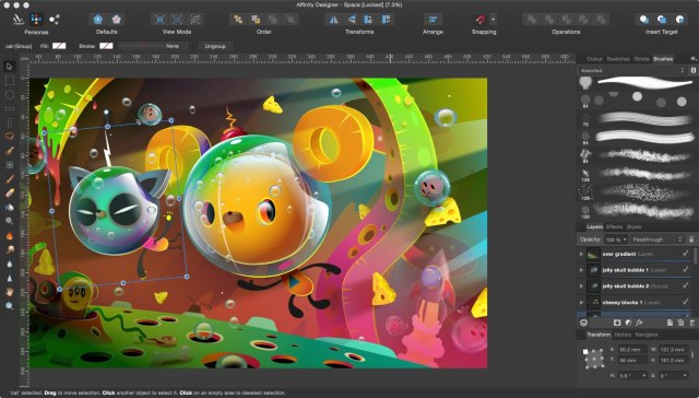 Масштабирование в Affinity Designer происходит со скоростью 60 кадров в секунду. Трансформация объектов, размещение их в правильной последовательности, применение эффектов и коррекция никогда не заставит приложение зависнуть, даже если вы работаете со сложной векторной иллюстрацией, которая содержит тысячи кривых. - Векторные и пиксельные кисти