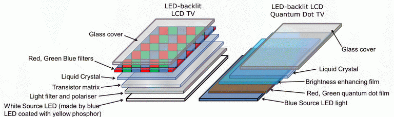 из википедии: Все существующие дисплеи которые заявляются как QLED, по факту являются LCD матрицей со светодиодной подсветкой на квантовых точках.