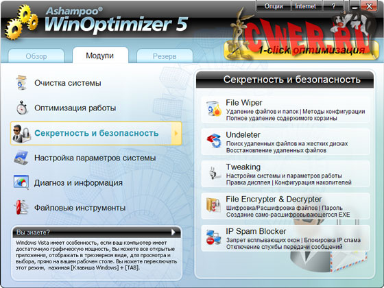Удобное меню представляет отдельные блоки Ashampoo WinOptimizer 5 и дает возможность измерять мощность системы, отключать раздражающие сообщения при автозапуске, или уничтожать ненужные файлы, и все это - одним нажатием клавиши.