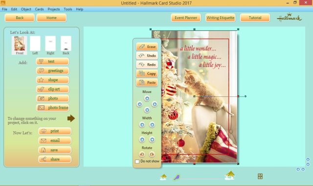 - С помощью Art Studio вы можете воплотить в жизнь собственные идеи. Возможности художественной студии позволяют смешивать и сочетать приветствия, рисунки, картинки и модели из Clip Art Library. Кроме того, вы можете добавить текст или даже импортировать в ваши собственные цифровые фотографии дополнительные детали, для придания им неповторимого колорита. Art Studio позволяет настроить размеры проектов для использования бумаги нестандартного формата или для преобразования стандартного дизайна в borderless design (без белых полей по краям).