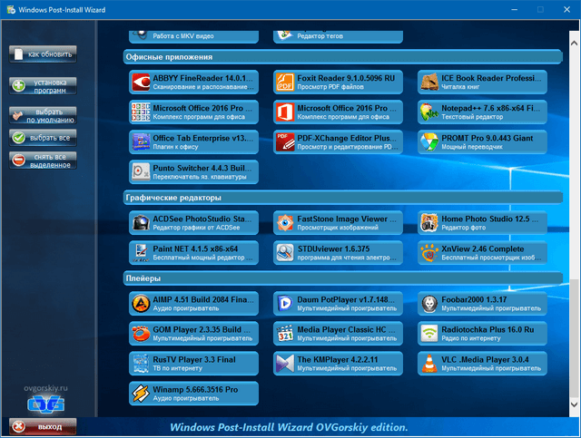 Пакет программ с "тихой" установкой, помещенных в оболочку установщика программ Windows Post-Install Wizard (WPI), программы разделены на категории и весь процесс установки и регистрации проходит полностью в автоматическом режиме. Вам стоит только выбрать необходимые программы и запустить установку. Все программы в сборке, имеют краткое описание. Большинство программ автоматически определяют разрядность системы и устанавливаются согласно ей. Все 32-х битные программы полностью совместимы с 64-х разрядной ОС. Сборка представлена в ISO образе, который можно записать на один DVD или просто распаковать в удобное для вас место архиватором WinRAR или WinZip. Можно смонтировать в виртуальный дисковод и скопировать от туда в отдельную папку.