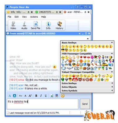 Так же можно установить разные режимы: away или invisible. Помимо всего прочего в программе имеется огромное количество смайликов.