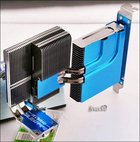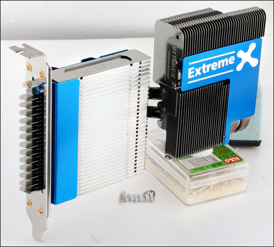 При первом взгляде на снимки продукта в глаза сразу же бросается применённая в изделии оригинальная система охлаждения, представляющая собой комбинацию водоблока для северного моста и нескольких радиаторов разных размеров и форм, соединённых друг с другом тепловыми трубками. Кроме того, дополнительно предусмотрен отдельный модуль из ещё двух экстравагантных по виду и очень крупных по габаритам радиаторов с тепловыми трубками, который устанавливается на специальную площадку рядом с водоблоком и способствует эффективному отводу лишнего тепла за пределы системного блока.