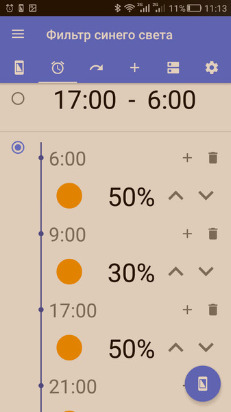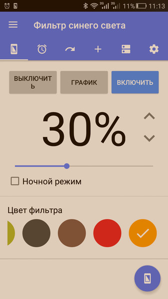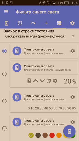 И хотя по умолчанию стоит фильтр синего цвета, программа позволяет менять цвет на некоторые другие, например, на красный или желтый. Вы сможете также активировать фильтр из строки состояния или запускать приложение при загрузке системы автоматически.