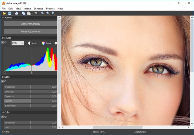 Astra Image — графический редактор, который позволит навести резкость и повысить разрешение цифровых изображений. Благодаря новой технологии обработки изображений, программа поможет улучшить и восстановить цвет и шкалу яркости изображения. Приложение позволяет вычислить статистические данные изображения, производить гистограммы, просматривать метаданные, получать изображения со сканера или камеры, а также печатать их.