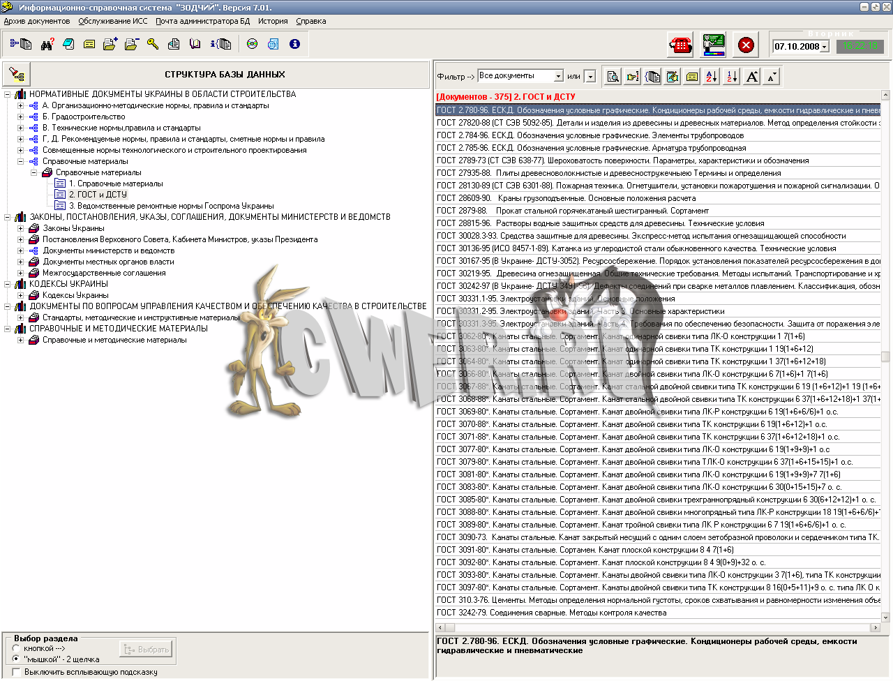 Программная оболочка ИСС "Зодчий" позволяет выполнять операции поиска по базам данных и доступу к их содержимому. Поэтому Вы всегда можете быстро найти любой документ или группу документов по различным признакам (дата, номер документа, название документа и т.п.), а также распечатать любой нормативный документ.