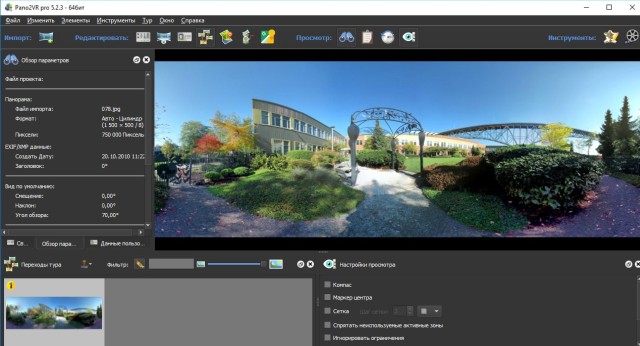 Pano2VR - великолепная программа для создания сферических и цилиндрических 3D панорам, а также виртуальных туров на их основе с различными эффектами и переходами. Поддерживает работу с форматами JPEG, PNG, TIFF, PSD, PSB, OpenEXR, Radiance HDR и файлами QuickTime VR с JPEG. Имеется возможность создавать собственные шаблоны для будущих панорам, добавлять в них кнопки, анимацию, звук и эффекты переходов.