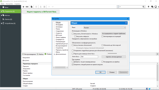 - Интерфейс uTorrent имеет поддержку смены тем и возможность перевода на другие языки.