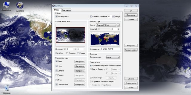 EarthView - динамические обои и скринсейвер в виде карты нашей планеты или глобуса вращающегося синхронно с оборотом земли (поддерживает смену дня/ночи, облака, огни городов). Приложение отличается высокой детализацией картинки и насыщенными цветами. Позволяет настроить качество изображения с учетом производительности вашего компьютера. Поддерживает возможность скачивания дополнительных фотореалистичных карт с сайта разработчика.