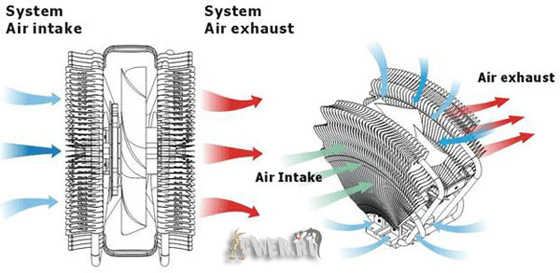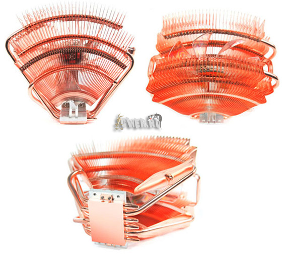 Это очень эффектное по внешнему виду решение с серийным номером CL-P0472 продолжает славные традиции, заложенные в модели Thermaltake V1, и основано на фирменной концепции Dual-V. Изделие изготовлено полностью из меди и состоит из отполированного до зеркального блеска основания, от которого отходят шесть длинных тепловых трубок, несущих на себе два массивных веерообразных радиатора с 98 пластинами каждый. В центре конструкции установлен рассчитанный на 50000 часов безотказной работы вентилятор типоразмера 140 х 140 x 30 мм с голубой светодиодной подсветкой, скорость вращения которого можно изменять при помощи специального выносного регулятора в диапазоне от 1000 до 1600 оборотов в минуту, причём во время работы "пропеллер" создаёт шум в пределах от 16 до 24 дБ. Что же касается общих габаритов новинки, то они составляют 171 x 100 x 161 мм, тогда как её вес равен 840 г.