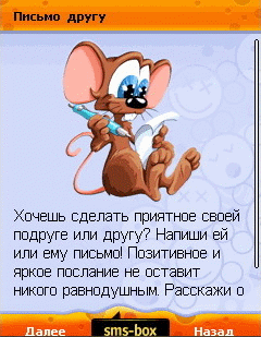 Этот выпуск посвящен общению между друзьями. Каждый день случаются ситуации (опоздания, извинения, мелкие обиды и крупные радости), которые можно оригинально обыгрывать, отправляя веселые SMS. А как часто вы говорите лучшим друзьям о том, что вы их любите, цените и ни на кого не променяете? Точно не каждый день. Мы предлагаем, наконец, выразить это и написать трогательное письмо с красочными картинками. Размеры экранов: 128х128, 128х160, 176х204, 176х220, 208х208, 240х320, 320х240, 352х416.