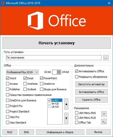 Распакую Microsoft Office 2019x86 (64).iso и будет язык. Или через Алкохол, даемон. Autorun.exe запускать с правами админа. Все ставится.