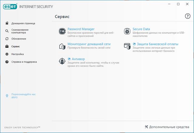 ESET Smart Security поможет сделать работу в интернете максимально защищенной и безопасной. Надежное распознавание всех видов угроз и высокая скорость сканирования стали возможными благодаря сочетанию новых «облачных» технологий и интеллектуальной расширенной эвристики ThreatSense.