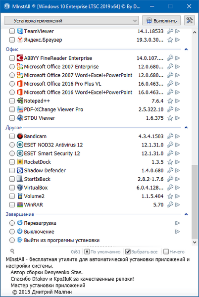 Сборник программ MInstAll для быстрой установки необходимого и часто используемого софта. Представленные программы уже зарегистрированы и не требуют активации. Данная сборка имеет компактный размер, почти все программы устанавливаются в тихом режиме.