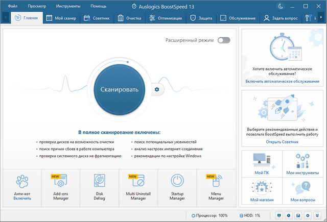 AusLogics BoostSpeed - приложение, которое поможет быстро и качественно произвести настройку ПК на максимальную производительность. Встроенный инструмент System Adviser проверит настройки системы с помощью пятидесяти различных тестов и предложит рекомендации по результатам каждого теста. Программа проверяет систему в режиме реального времени и если находит, что какой-то из параметров можно оптимизировать, то обязательно информирует вас об этом.