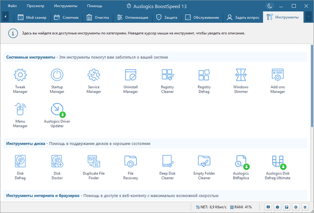 • Удобная навигация. Aбсолютно новый интерфейс BoostSpeed 6 позволяет легко управлять программой. Все утилиты и функции быстро доступны. Основные задачи - очистка дисков, исправление ошибок в реестре, а также дефрагментация файлов могут быть выполнены с помощью всего нескольких кликов мышки! Программа отображает текущее состояние компьютера и, в случае необходимости, предлагает выполнить проверку системы.