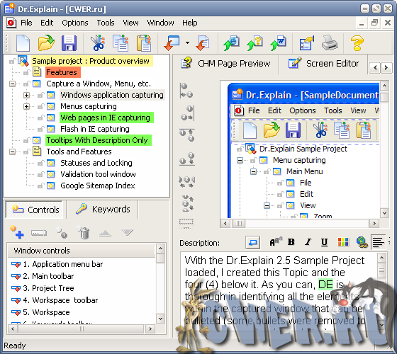 Dr.Explain - программа для создания справочных файлов CHM, электронных книг, печатной документации. При помощи технологии, которую использует данная программа, файлы помощи можно создавать практически в автоматическом режиме. Не нужно форматировать текст, обрабатывать скриншоты: программа сама захватывает изображение вашей программы, анализирует его, создает интерактивный скриншот со ссылками, создает меню и навигационные связи. Встроенный редактор аннотаций позволяет добавить к скриншоту описание, что-то подчеркнуть, вставить при необходимости в нужное место, например, стрелку и прочее. Кроме этого, программа позволяет "выдергивать" текст оттуда, откуда он не перемещается с помощью команд копирования и вставки.