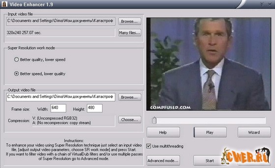 Если фильм не очень динамичен, то можно теперь свободно изменить и разрешение экрана. Особенно удобен для домашнего видео, где съемка производится в условиях плохой освещенности и для исправления некорректной работы некоторых моделей бытовых видеокамер. Работает с любыми видеофайлами которые воспроизводит Windows Media Player (AVI, WMV и ASF) и с MOV,RM и RMVB, если в системе установлены соответствующие проигрыватели: "QuickTime Alternative" и Real Alternative. Прекрасно подойдёт для разворачивания во весь экран с малой потерей качества роликов, скачанных с таких сервисов как youtube.com, rutube.ru, video.mail.ru, intv.ru и др.