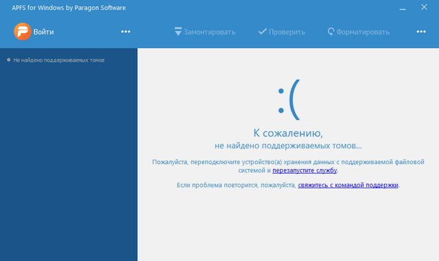 - Поддержка контейнеров APFS. Текущая версия драйвера поддерживает единственную конфигурацию, в рамках которой все контейнеры APFS располагаются на одном физическом носителе.