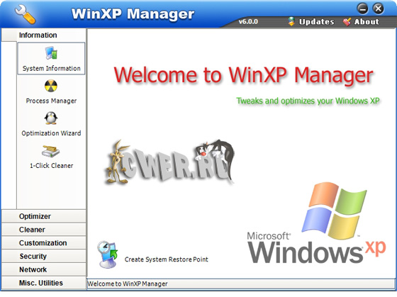 Программа предлагает простейший способ оптимизации, настройки и ускорения системы Windows XP. Сочетает в себе больше чем 30 различных утилит, дает доступ к сотням скрытых настроек для улучшения производительности и безопасности, очистки реестра и удаления мусора, оптимизации сети для ускорения Интернет соединения, создания копии данных из Outlook Express, управления папками обмена, а также другие разнообразные утилиты.