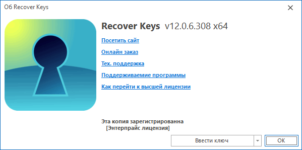 Теперь вы можете защититься от такой проблемы и надежно сохранить дубликаты всех своих ключей! Recover Keys оперативно производит анализ вашей системы и около 11000+ программных продуктов и составляет список активационных ключей для этих программ. Ну а затем вы сможете уже сохранить, пересохранить, распечатать, или экспортировать в (Word, Excel, PDF, HTML, CSV, XML) лицензионная информация. Благодаря удобному интерфейсу и доступным функциональным качествам, Recover Keys может с легкостью использоваться как профессионалами, так и не очень опытными пользователями.