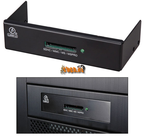 Второй новинкой стала модель Lian Li Card Reader, представляющая собой встраиваемое в лицевую панель системного блока средство для чтения/записи карт памяти форматов SD, SDHC, MMC, RS-MMC, MMC Plus, MS, MS Duo, MS PRO, MS PRO Duo, MS PRO HS и MS PRO Duo HS. Аппарат подключается и питается по шине USB 2.0 Hi-Speed, оборудован светодиодным индикатором состояния, а также совместим с платформами Mac OS 9 и Windows 98/ME/2000/XP (увы, поддержка Windows Vista не реализована). Изделие обладает габаритами 102 x 25 x 60 мм и тоже доступно в чёрном (код CR-26B) либо серебристом (код CR-26A) исполнении.