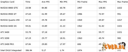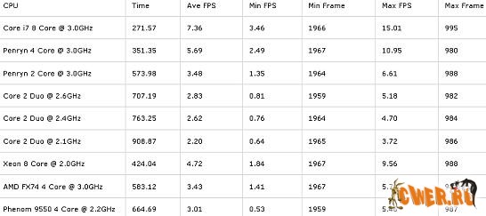 Microsoft провела тестирование, чтобы показать возможности WARP10. Всё оказалось не так уж плохо. По крайней мере, некоторым процессорам тягаться со встроенной графикой от Intel было вполне по силам. Тестирование проводилось с помощью игры Crysis в режиме 800х600 пикселей с низкими настройками качества.