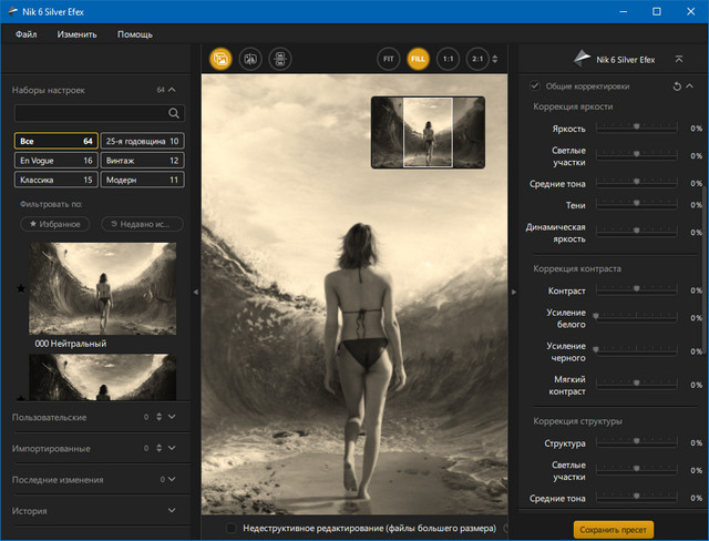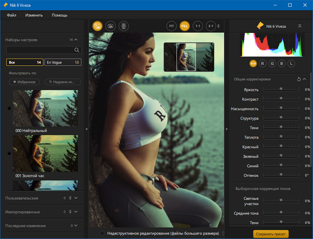- Интуитивно понятный интерфейс, с простой понятной фотографической терминологией и постоянным отображением фактических результатов обработки.