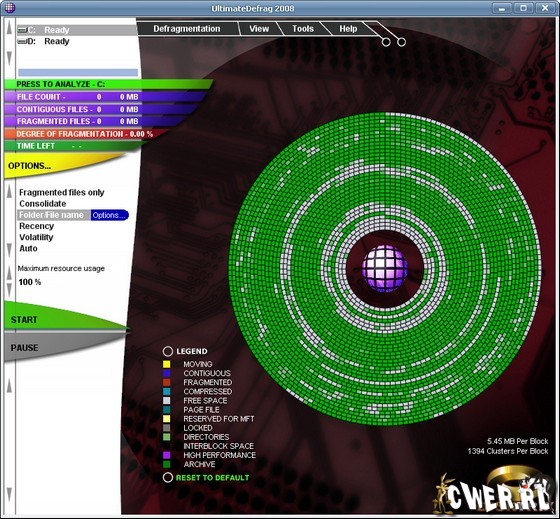 UltimateDefrag - уникальный дефрагментатор и оптимизатор размещения файлов на жестком диске, который учитывает больше чем только фрагментацию файлов! Фрагментация файла - только незначительная часть улучшения работоспособности накопителя на жестком диске - другая более важная часть - относительное размещение наиболее часто используемых файлов на вашем накопителе, и одинаково важная - максимизация - уплотнение файлов. Программа имеет очень высокую скорость работы и позволяет достигнуть максимальных результатов.