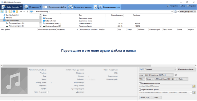 EZ CD Audio Converter - утилита для преобразования аудио-CD в качественные цифровые аудиофайлы, а также для записи MP3, WAV MP4, Windows Media Audio, FLAC, Ogg Vorbis, AAC и Monkey-s файлов на аудио-CD. Умеет преобразовывать аудиотреки непосредственно в MP3, WMA, VQF, OGG или WAV и конвертировать из одного аудиоформата в другой.