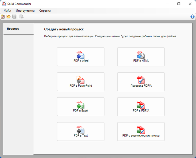 Solid Commander — утилита для автоматизированного преобразования PDF в Word, производит проверку на соответствие формату PDF/A validation, а также преобразование PDF в PDF/A и создание PDF с возможностью поиска и извлечение текста.